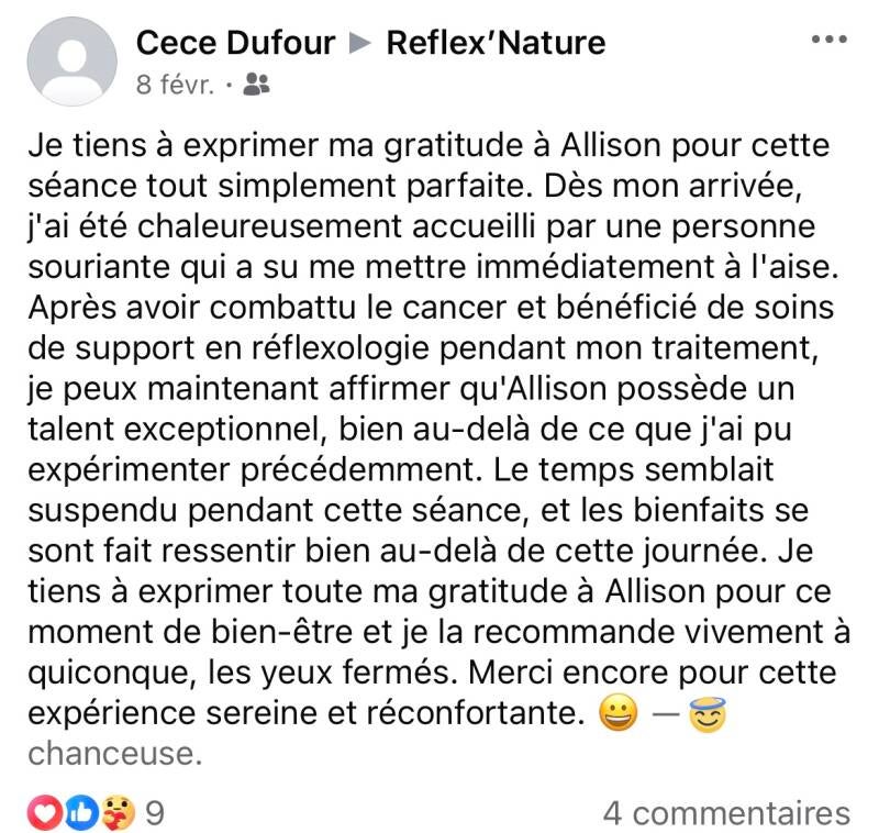 Séances de réflexologie juste parfaite Allison et très douce ce moment a été très agréable pour moi elle et très à l’écoute je vous la recommande fortement aller y les yeux fermer merci pour ce merveilleux moment